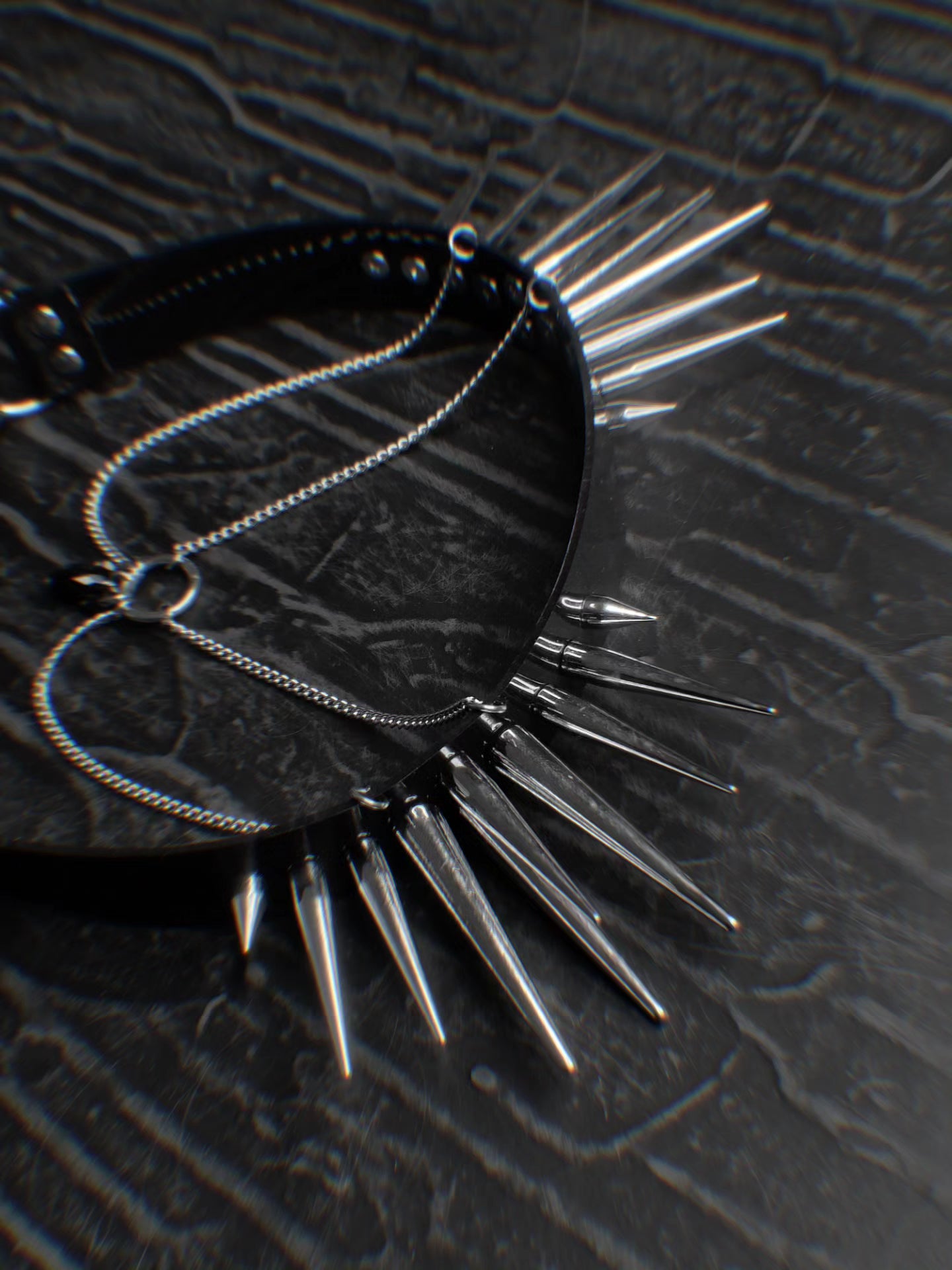 DIVA tiara - glossy black PVC headband arranged with two spike clusters with extra long spikes for that cat-like silhouette. Chain veil across the forehead and black crystal accent jewellery.
