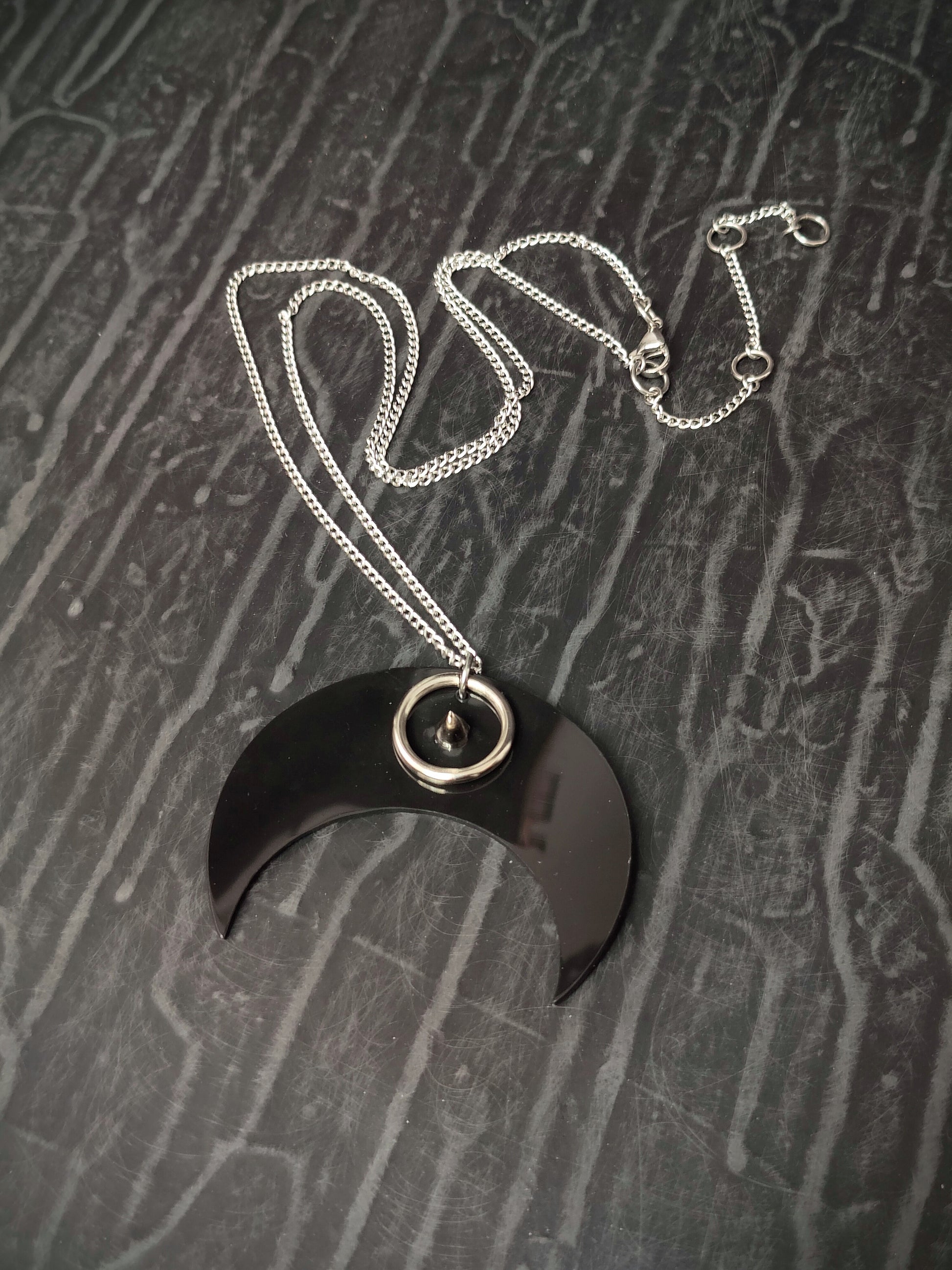 MEWN necklace - vinyl moon pendant with one of our favorite details: ring-over-spike center - hanging on long 90cm stainless steel chain.