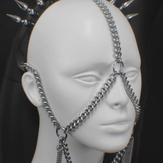 WIDOW - headdress composed of steel chain mask/harness front and chunky spike halo headband with 8 large spikes.